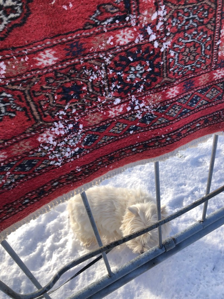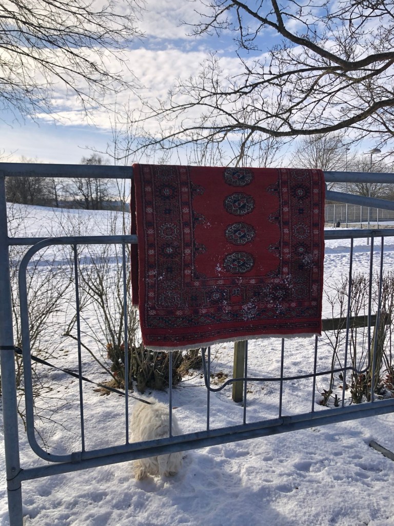 Idag kunde vi lägga mattan i snön och borsta den ren!