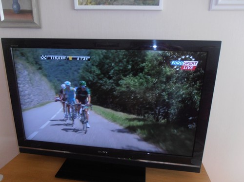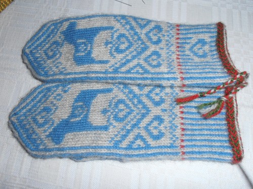 Jag sitter i soffan, tittar och stickar några varv på vantarna istället..