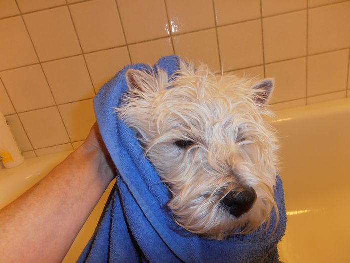 Elis gillar inte att bada – varken ute eller i badkaret…han undviker vattenpölar!!