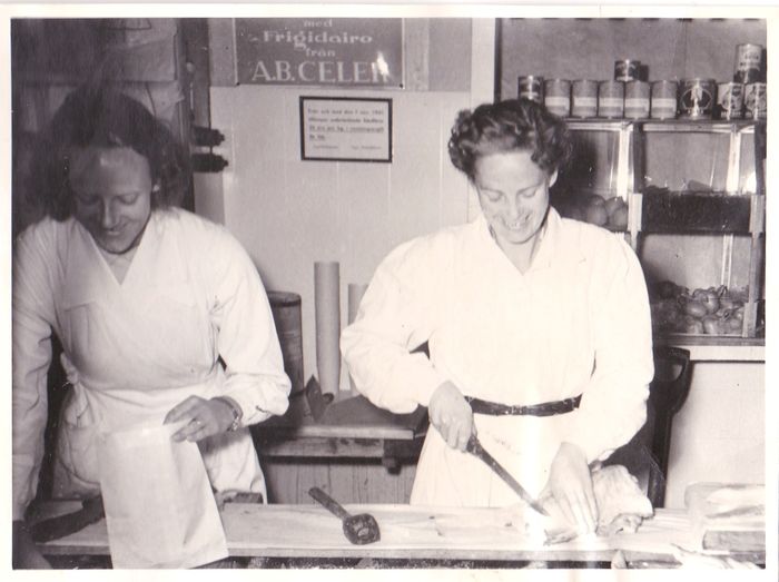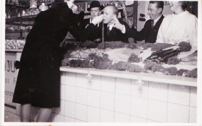 Morbror Åke med hatten, bredvid står Hilmer och mamma i vit rock -. Moster Elsa är kund. (kan vara i Sigtuna eller Källgatan )