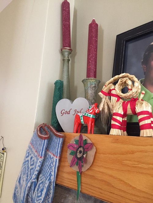 Halmbocken från Formgruppen samsas fint på hyllan med dalahästen.