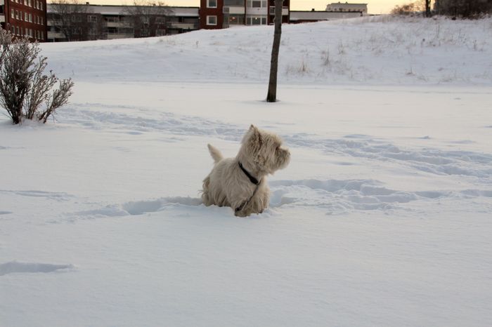 Inte en snöklump fastnar i pälsen – men tyvärr så blev det töväder igen