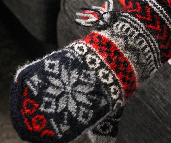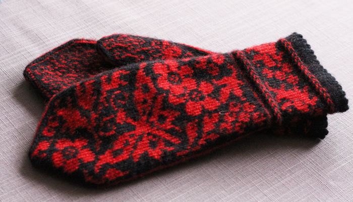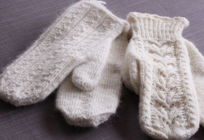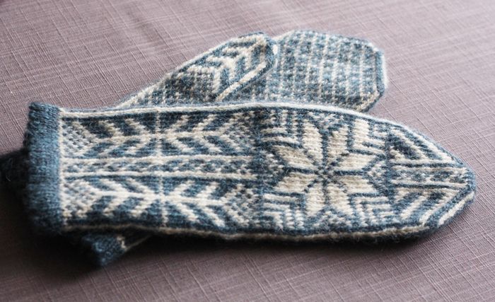 och vanten till höger ”Snövit” i vanlig mönsterstikning i enkelt garn