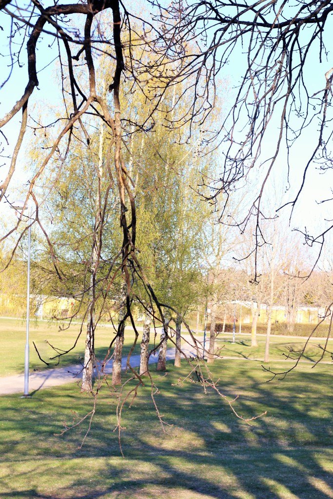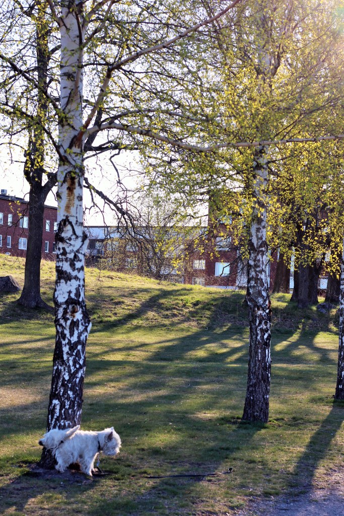 Utsikt från köksfönstret.. Ornäsbjörken har slagit ut och solstrålarna lyser upp det gröna 🙂