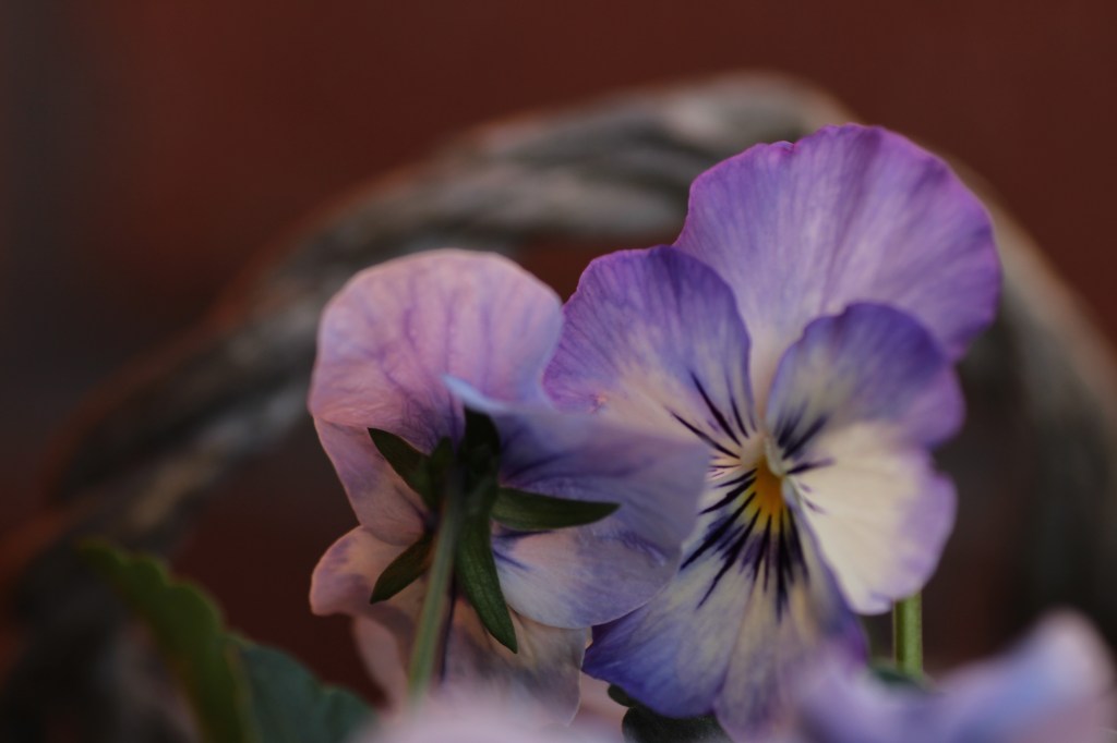 Så vackert med mini penséer i kvällssol – så nära med makroobjektiv.