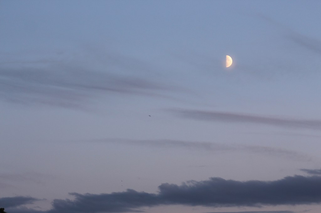 Solnedgång 21:22 och lamporna är tända på gården – mörkret kryper på oss vänner.