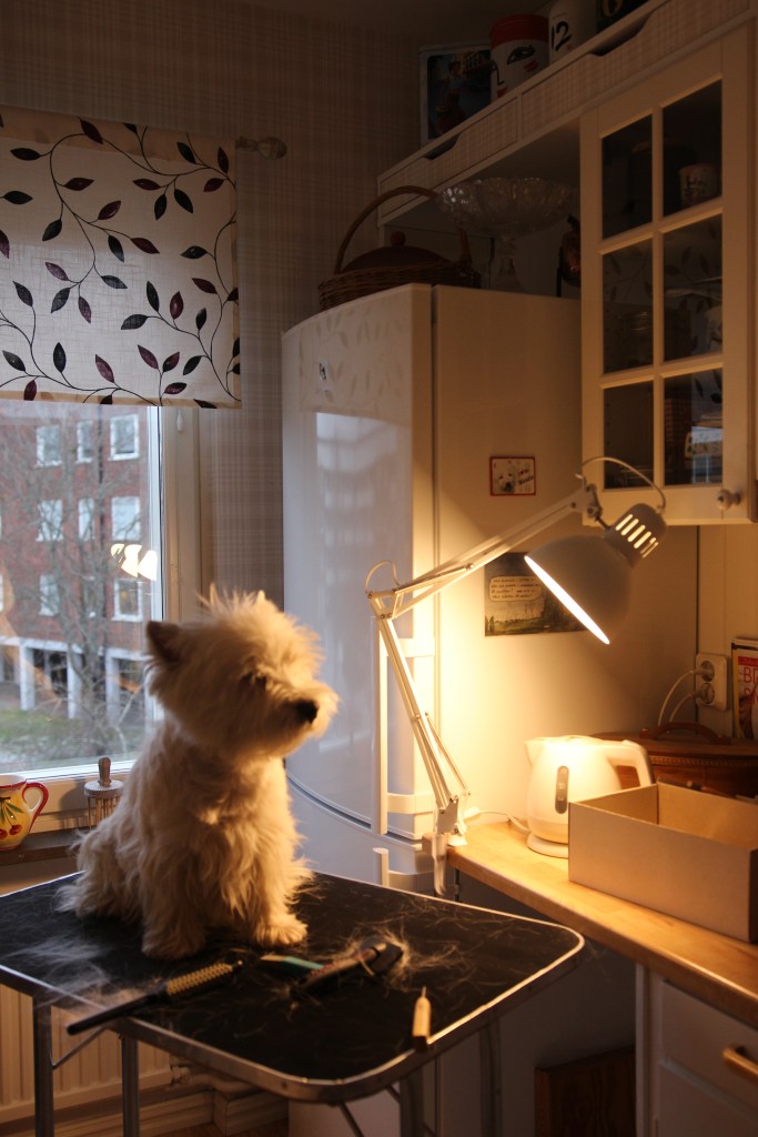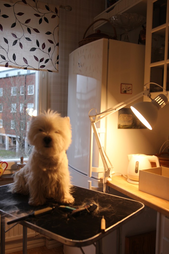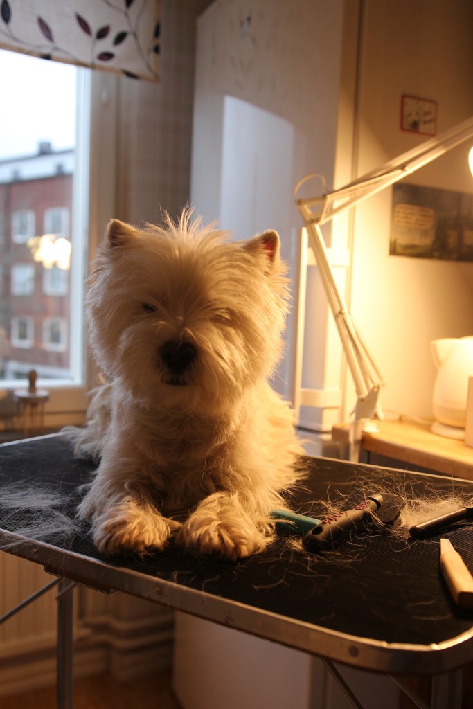 Milou ligger under trimbordet och väntar på korv
