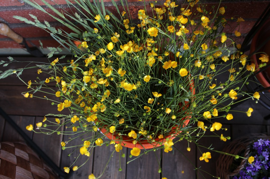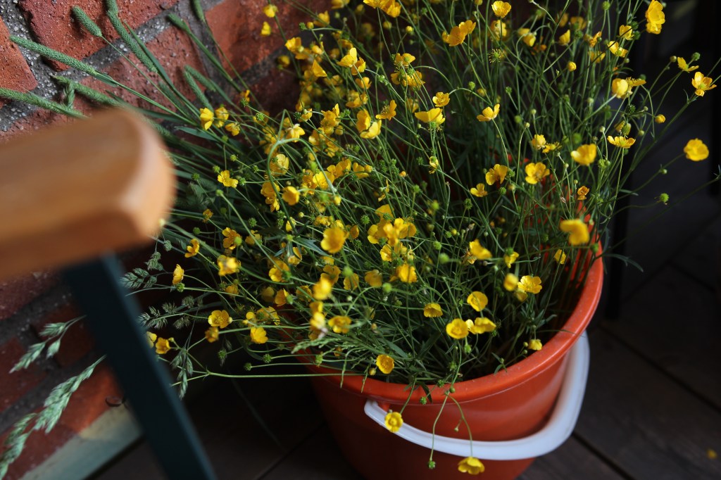 Så här står hinken med smörblommor och väntar….på årets sommarpynt !