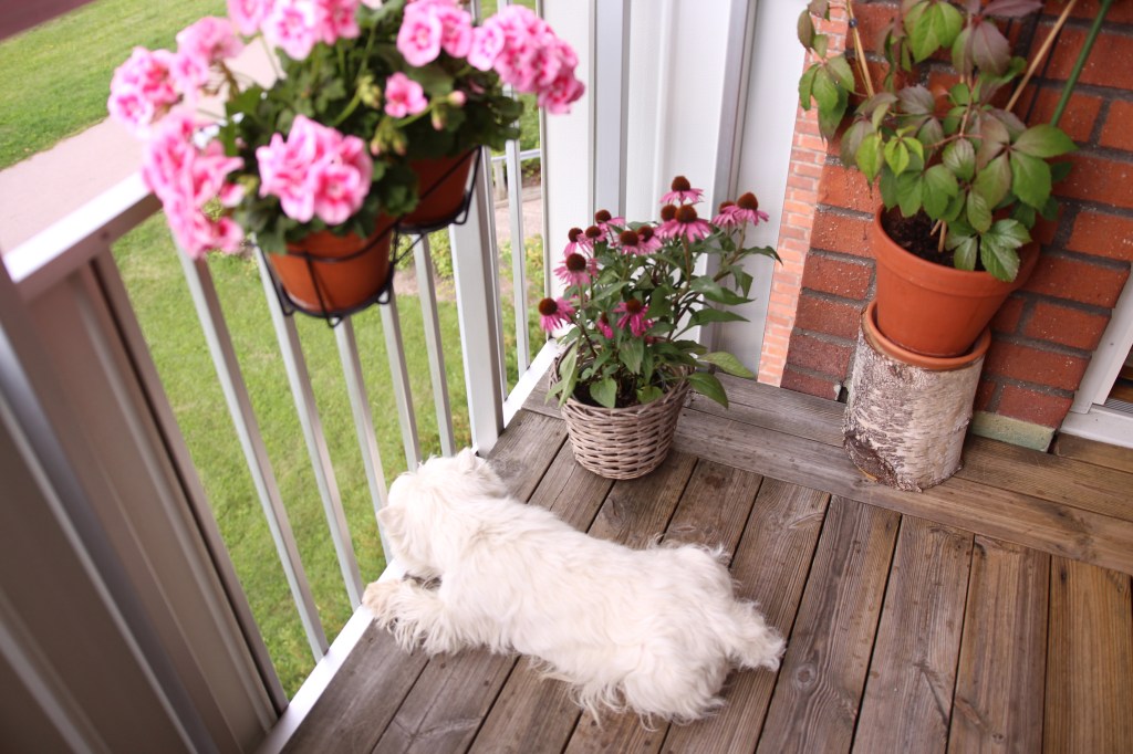 Åska, regn och hagelskurar stormar rakt in på balkongen! Mina blommor har fått flytta in till väggen.