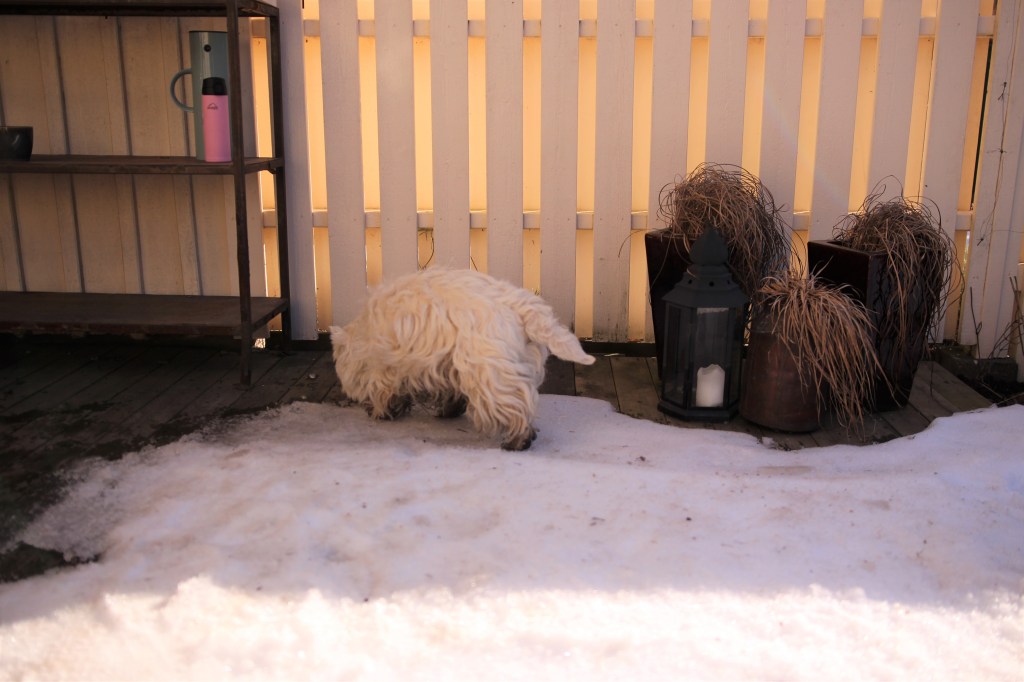 Knähunden Milou på mattes hala kappa – rör man sig åker man ner i backen !