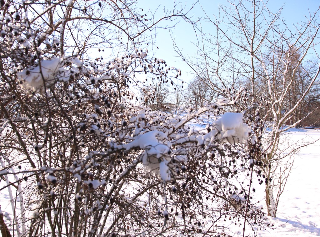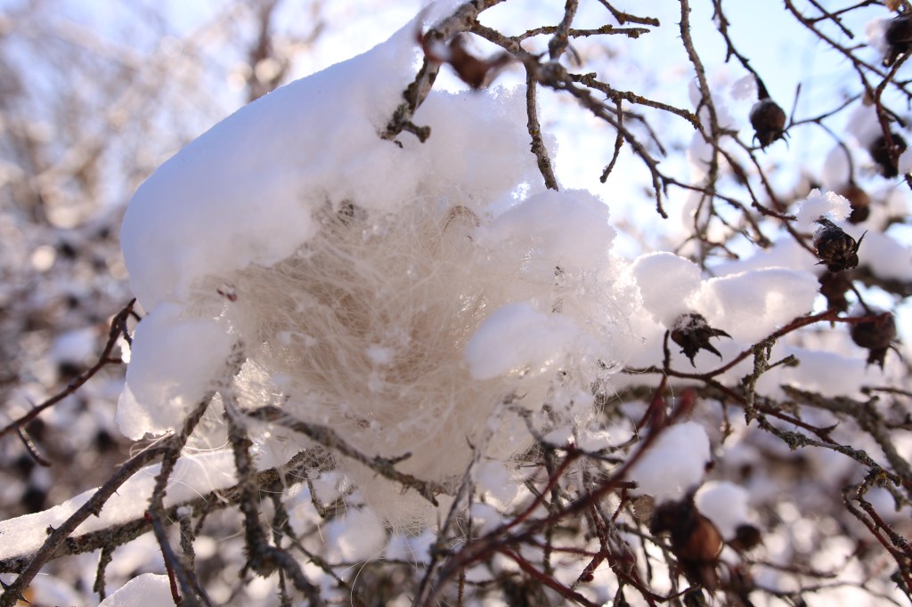 Ull värmer vänner – byggmaterial till våra fåglar väntar under snön…