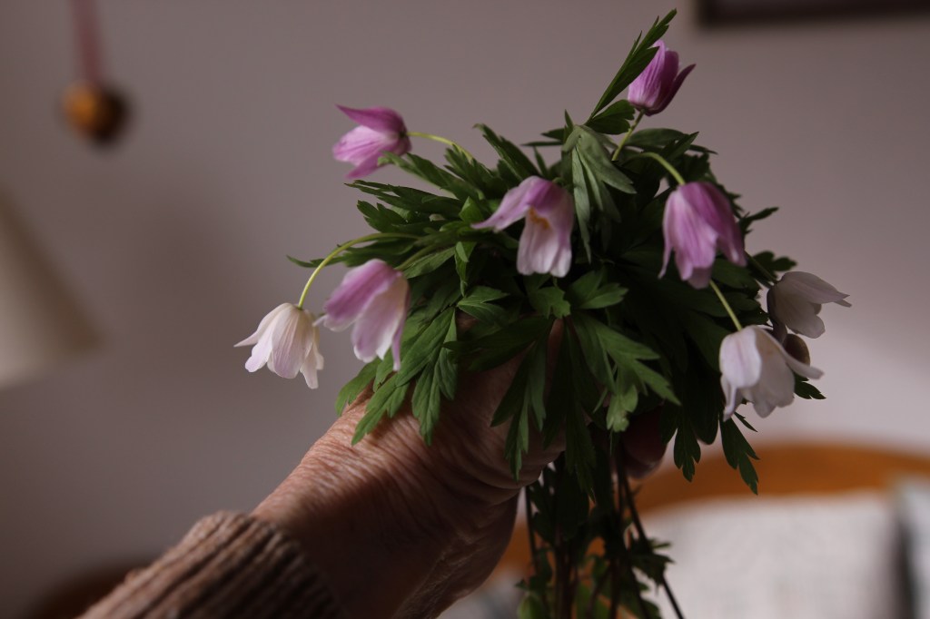 Morgonens bukett går i rosa och vita vitsippor 🙂