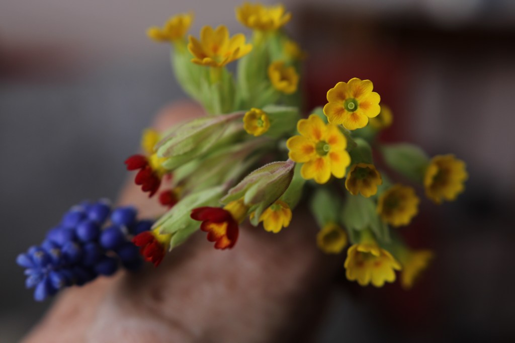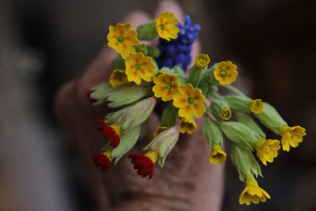 Älskar att plocka blommor – en skrynklig hand med årets första gullvivor ❤