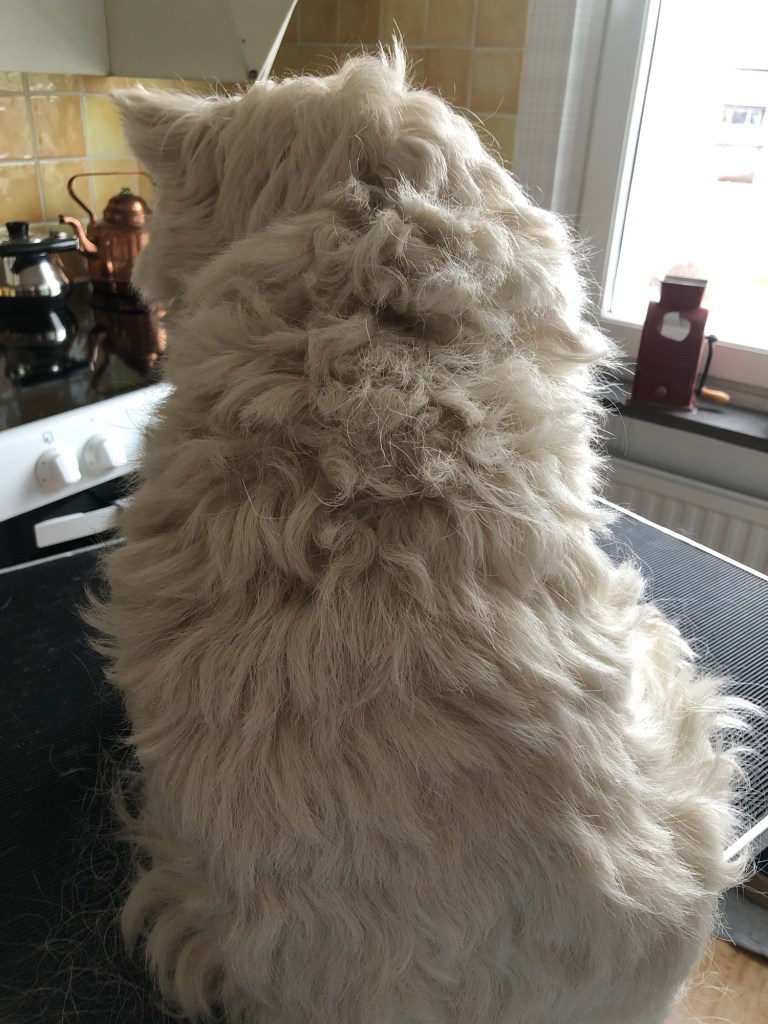 Två kvaliteters päls behöver blandade verktyg – sax och trimkniv – det blir nog en ”en liten vit igen”