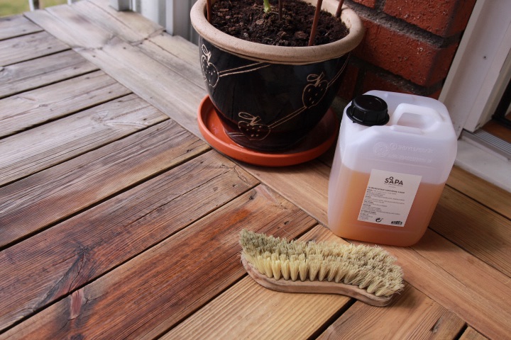 Dag 2 -Skurar jag in rikligt med kallt såpvatten och trallen får suga åt sig. ( 1 l såpa. 10 l vatten) jag tog en halv hink.