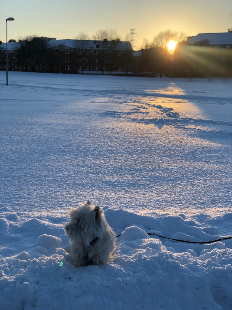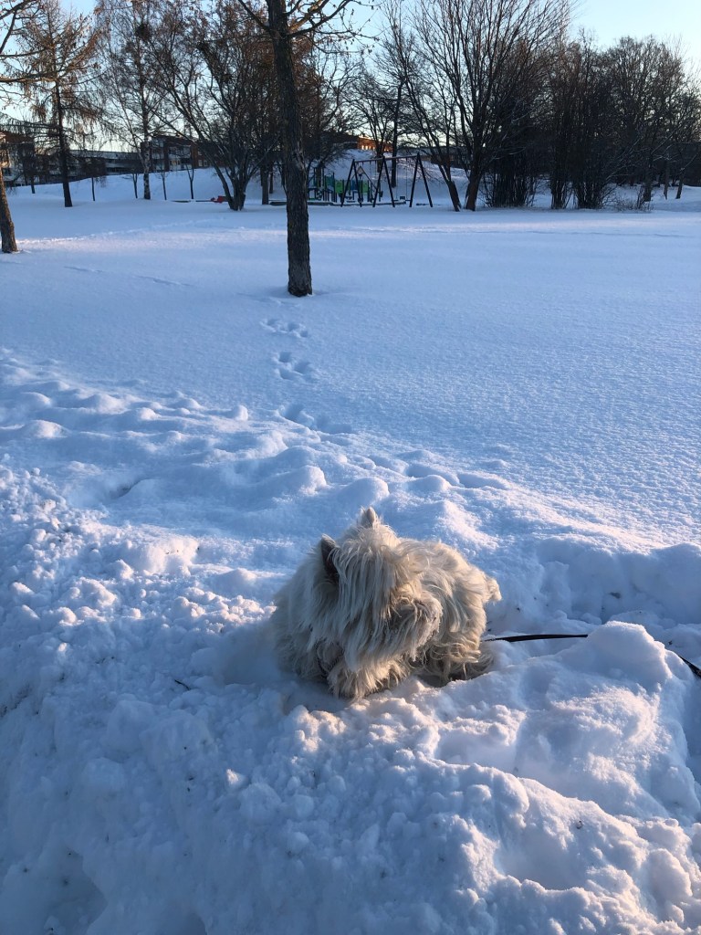 Men härligt för oss som gillar snö – nu får matte ploga en väg över ängen …