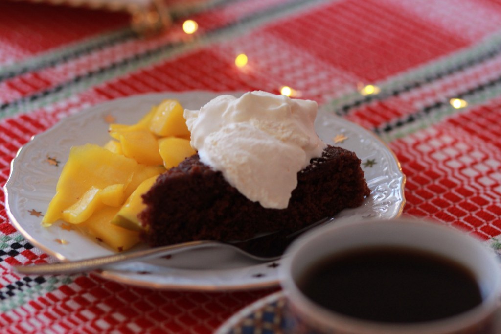 Kaffe,en klick vispgrädde med mango bitar – mums !