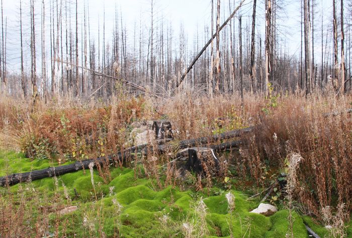 Vi måste stanna och klappa på den mjuka mossan – som växer i det svarta