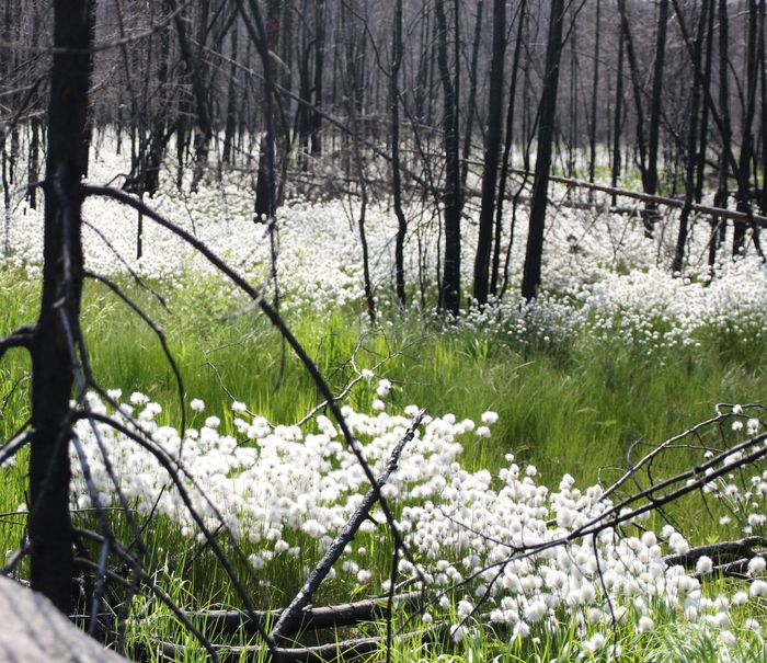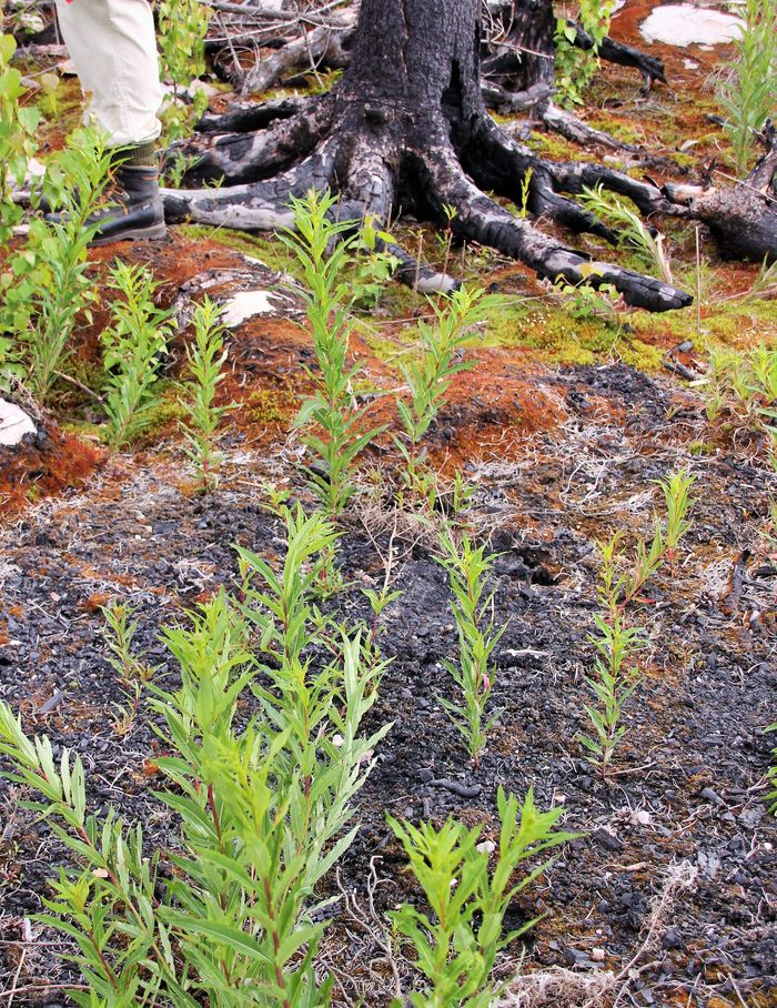 Björkarna har växt upp igen sen branden 2014 . Stubbarna har lite spår av svart bark.