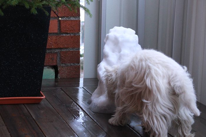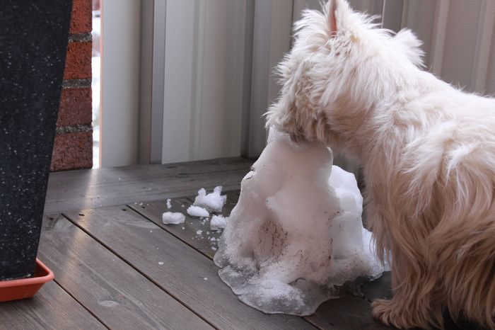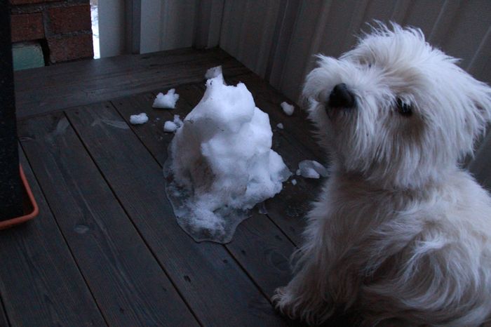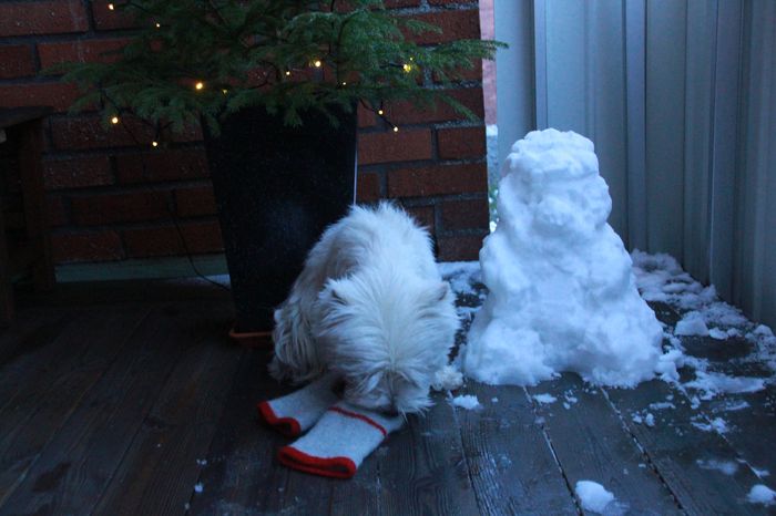 Istället för att skotta tung snö på balkongen -byggde vi en snögubbe eller en ”snöpudel”