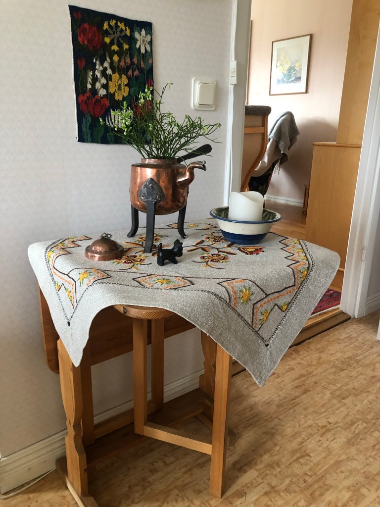 Arvegods från mamma, draperi i Ryssbo, nu en duk…älskar färgerna 💚