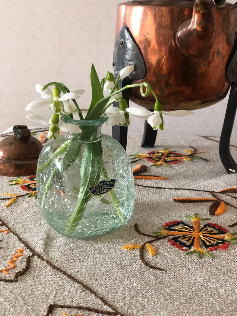 Gammal ljuslykta från Boda och blomvasen är ett minne från en god vän 💚 med några kvistar av lärkträd.